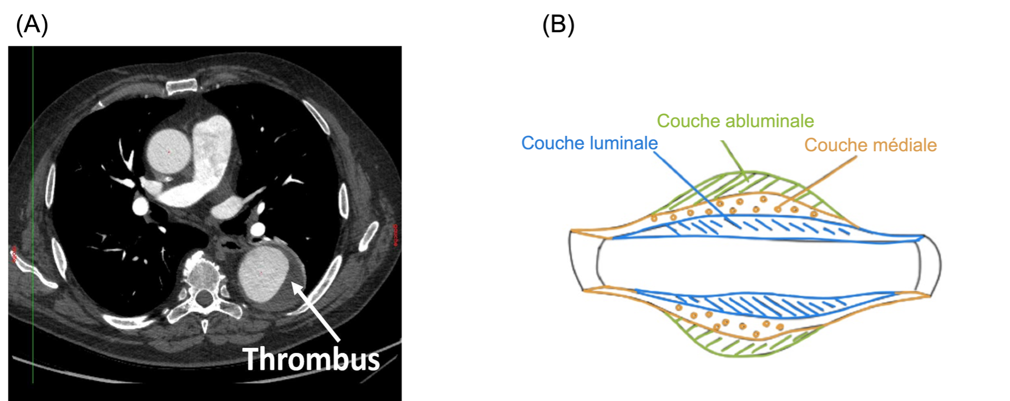 Figure 1. Représentation du thrombus intraluminal (ILT). (A) CT-scan d’un AAA avec un ILT. (B) Représentation schématique des différentes couches de l’ILT.