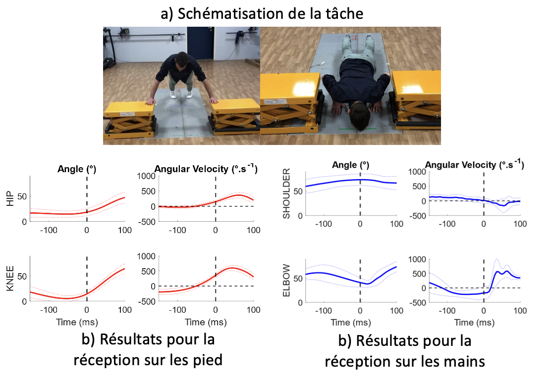 Nous comparons l’anticipation du contact lors d’une réception sur les pieds et d'une réception sur les mains, chez deux populations différentes. Dans une première expérience, 15 participants ont sauté depuis une plateforme rigide de 35 cm de haut, et se sont réceptionnés sur deux plateformes de force. Durant une seconde expérience, 16 participants se sont réceptionnés sur leurs mains en position de pompe, en partant de cette même plateforme rigide à 35 cm de haut. Durant cette tâche, les participants devaient garder leurs bras le long du tronc, afin de limiter l’abduction au niveau des épaules. Durant les deux tâches, les participants étaient autorisés à se familiariser avec les tâches. Durant les deux expériences, les participants étaient équipés de marqueurs réfléchissants disposés sur les points anatomiques afin de calculer les angles articulaires.