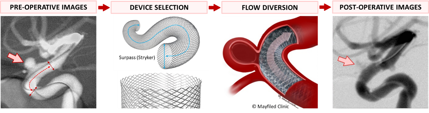 La rupture d’un anévrisme intracrânien provoque une hémorragie dans l’espace entourant le cerveau, une urgence médicale grave associée à un risque élevé de mortalité et nécessitant une prise en charge immédiate. Les techniques endovasculaires sont aujourd’hui le traitement de première intention, notamment la diversion de flux, qui consiste à implanter des stents à haute densité pour isoler le sac anévrismal et réduire l’afflux sanguin. Pour choisir le dispositif le plus adapté pour un patient, cette approche repose toutefois sur des mesures manuelles réalisées à partir d’images médicales, ce qui comporte un risque d’erreur susceptible d’entraîner des complications péri- ou postopératoires (Figure 1).