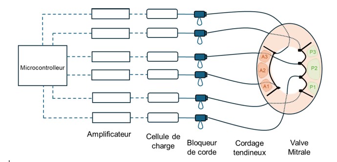 La régurgitation mitrale (RM) est l’une des dysfonctions valvulaires cardiaques les plus répandues, affectant 2 % de la population mondiale. Elle correspond à une perte d’étanchéité de la valve mitrale qui peut conduire à des signes d’insuffisance cardiaque. La RM peut être le résultat de différents mécanismes structurels affectant soit la valve directement, soit les structures environnantes, en particulier les cordages tendineux, qui relient les feuillets de la valve à la paroi interne du ventricule. La simulation de cette pathologie sur simulateur cardiaque in vitro, est importante non seulement pour mieux comprendre le lien entre mécanismes et sévérité de la RM, mais aussi pour développer et valider des outils diagnostiques. Cependant, la géométrie de la valve mitrale et de l’appareil sous-valvulaire sont complexes, les simulateurs cardiaques actuels sont limités par leur faible précision et leur incapacité à reproduire une large gamme de mécanismes de RM. Nous proposons ici un système permettant de modéliser in vitro différents mécanismes et degrés de sévérité de RM. Nous avons modifié un simulateur in vitro pulsé de cœur gauche précédemment décrit. Six fils en fluorocarbone ont été attachés aux feuillets d’une valve mitrale synthétique pour simuler six cordages. Chaque fil était connecté à une cellule de charge, elle-même reliée à un microcontrôleur pour mesurer la force de tension dans les cordages. La tension a été ajustée manuellement à l’aide de bloqueurs de corde afin de simuler différents mécanismes de RM, de type restrictifs (tension telles que le segment du feuillet concerné reste en position ouverte au moment de la phase de fermeture de la valve), ou de type rupture (tension telle que le segment du feuillet concerné prolapse vers l’oreillette gauche). Le débit cardiaque et les pressions dans l’oreillette gauche et le ventricule ont été mesurés. Les tensions des cordages ont été établies par des tests essais/erreurs pour produire des niveaux croissants de RM, qui ont été classés en calculant la fraction de régurgitation (FR), déduite du débit cardiaque. Nous avons pu créer un ensemble reproductible de onze configurations de tension dans les cordages simulant différents niveaux de RM, allant de son absence à une RM modérée à sévère. En l’absence de RM (FR de 0 %, condition témoin), la pression moyenne dans l’oreillette gauche était de 7,6±3,6 mmHg, celle dans le ventricule gauche était de 55,8±1,2 mmHg, et le débit cardiaque était de 4,6±0,1 L/min. Lors de la simulation d’une RM modérée à sévère (FR de 48±1 %) associée à un débit cardiaque de 2,4±0,1 L/min, comme attendu, la pression moyenne dans l’oreillette a augmenté (12±5,5 mmHg) et celle dans le ventricule a baissé (28,0±2,5 mmHg). Ce système de régulation de la tension dans les cordages d’une valve mitrale permet de simuler de manière simple et reproductible une large gamme de RM sur un simulateur cardiaque in vitro. Il sera utile à de nombreuses applications incluant le développement d’outils d’imagerie diagnostique, les tests précliniques de dispositifs de réparation valvulaire et le développement de stratégies chirurgicales personnalisées.
