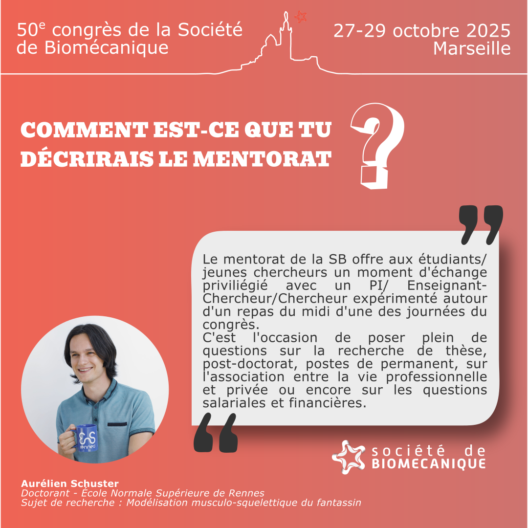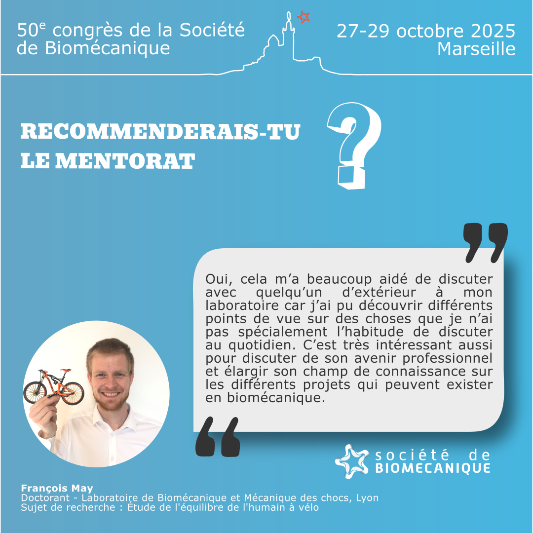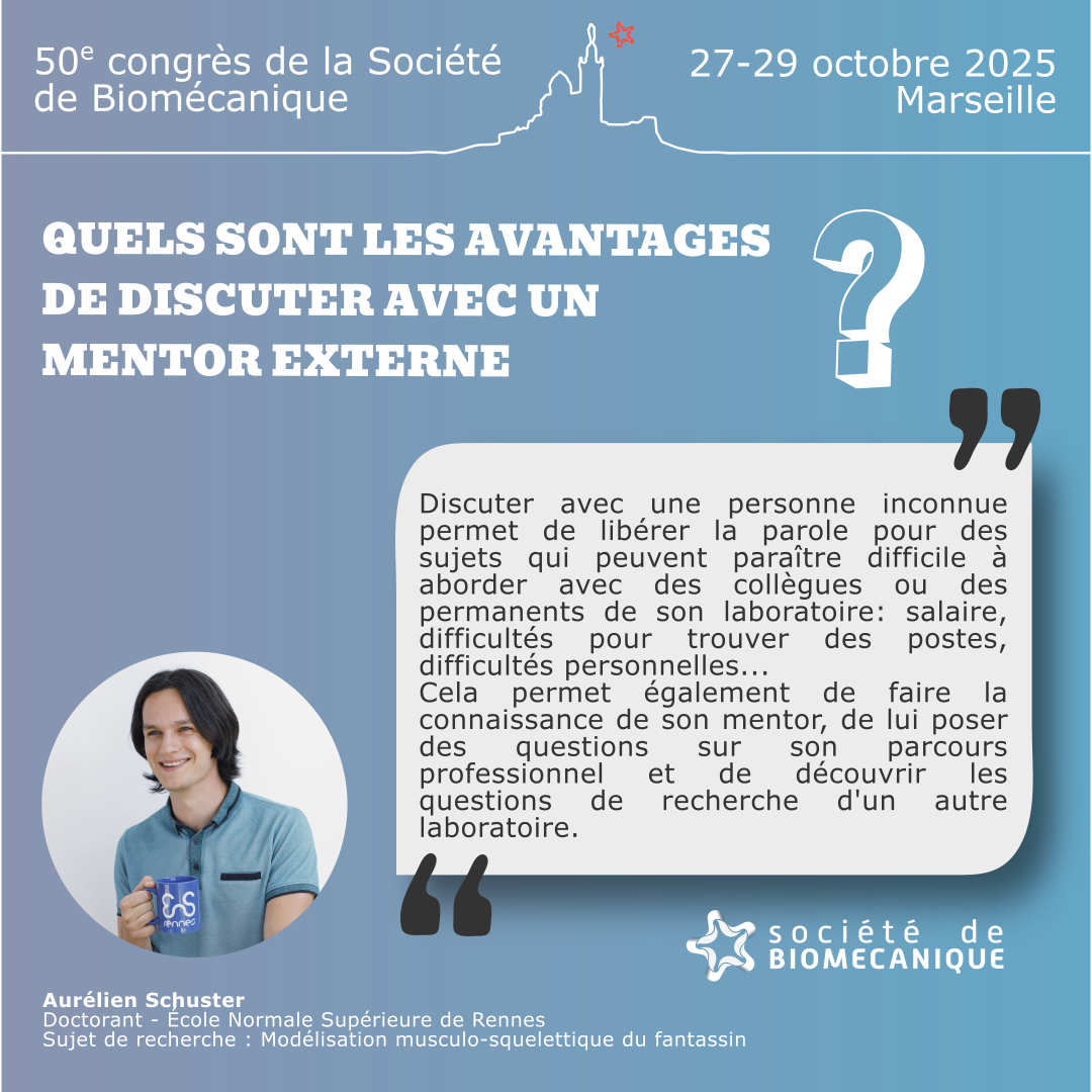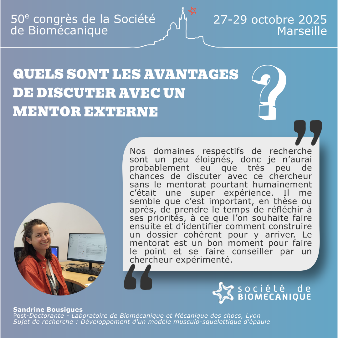 La Société de Biomécanique a mis en place un programme de mentorat à destination des membres de la Société de Biomécanique participant à la conférence annuelle de la société.