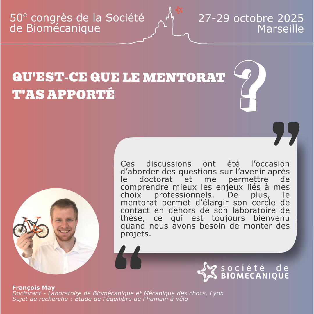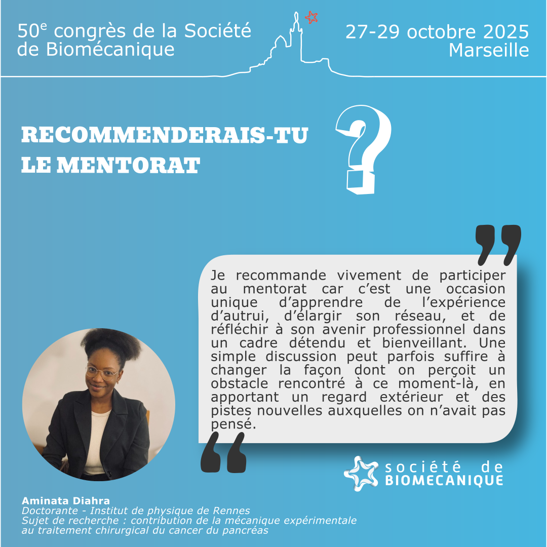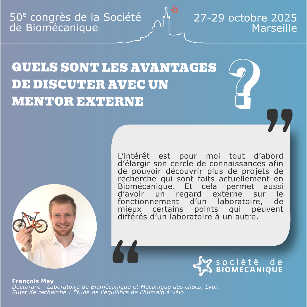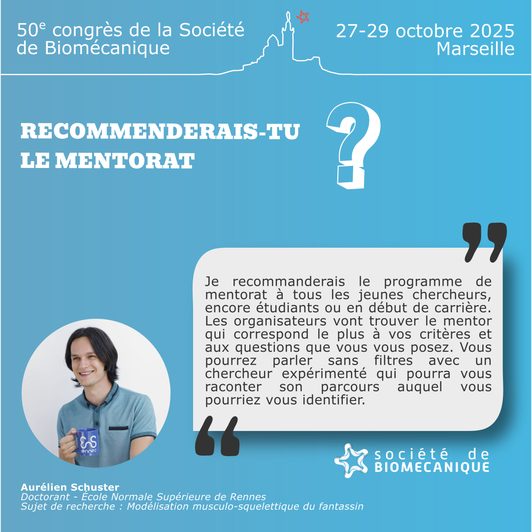 La Société de Biomécanique a mis en place un programme de mentorat à destination des membres de la Société de Biomécanique participant à la conférence annuelle de la société.